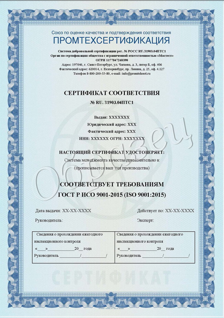 Нашей главной особенностью является наличие собственной системы добровольной сертификации (СДС) "Промтехсертификация", одобренной Федеральным агентством по техническому регулированию и метрологии (Росстандартом). В нашей СДС мы выдаем официальные документы, которым доверяют контрагенты и покупатели.